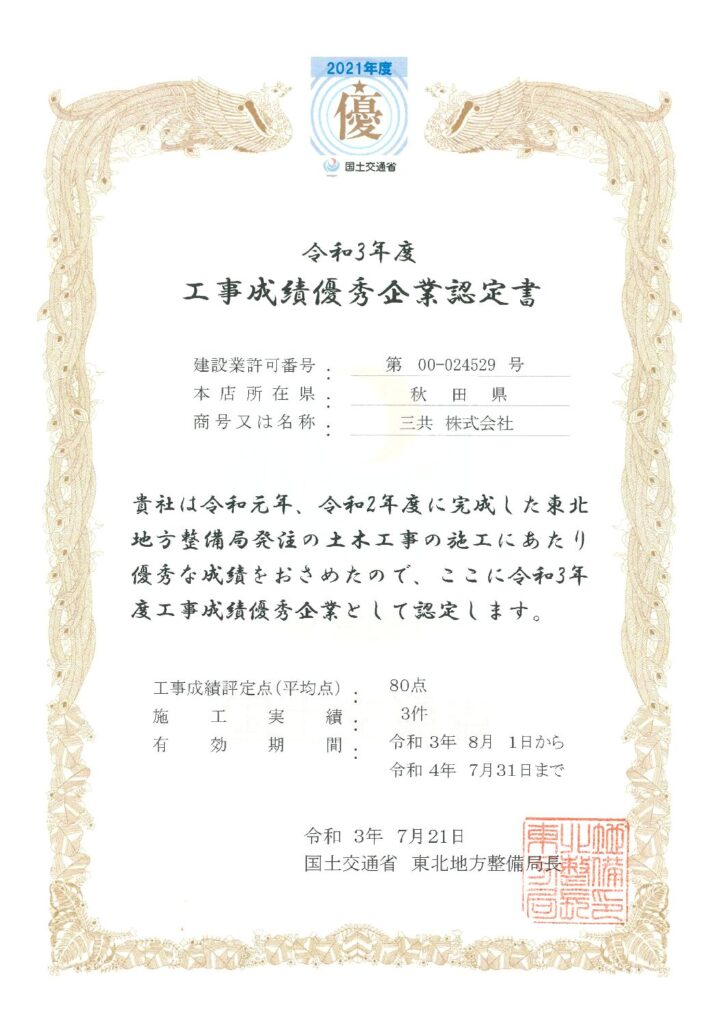 平成30年度から4年連続で、国土交通省東北地方整備局長より「工事成績優秀企業」に認定されました。