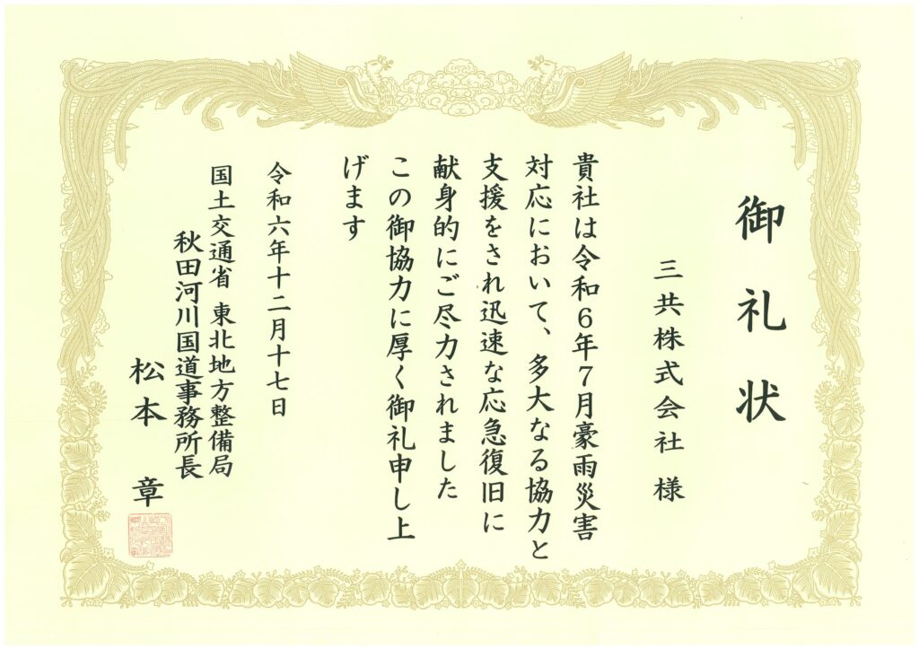 東北地方整備局秋田河川国道事務所より御礼状を頂きました。